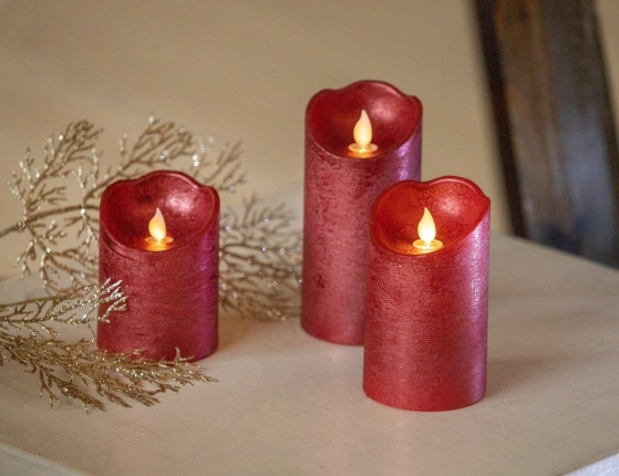 Свечи. Светодиодная восковая свеча ПРАЗДНИЧНАЯ, с глиттером, красная, тёплый белый LED-огонь колышущийся, 7.5x15 см, батарейки, таймер 480598. IntexCorp - интернет магазин.