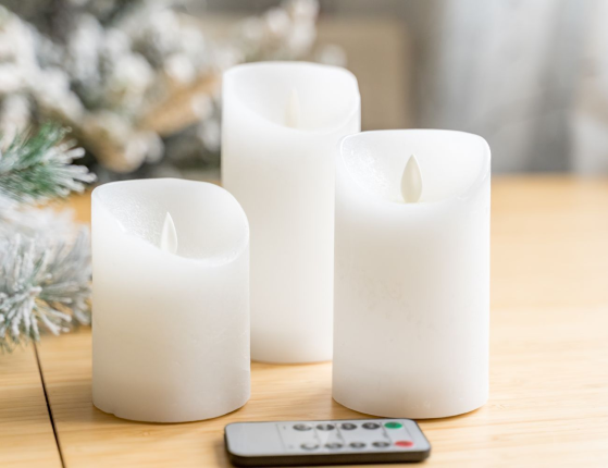Набор восковых свечей МЕРЦАЮЩИХ, белых, тёплые белый LED-огни, колышущееся пламя, 7.5х10-12.5-15 см, батарейки, таймер, диммер, ПДУ, 3 шт.