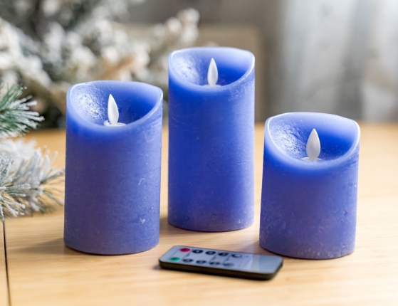 Товары для дачи и сада. Набор восковых свечей МЕРЦАЮЩИЕ, синие, тёплые белые LED-огни, колышущееся пламя, 7.5х10-12.5-15 см, батарейки, таймер, диммер, ПДУ, 3 шт. MB-20364. IntexCorp - интернет магазин.
