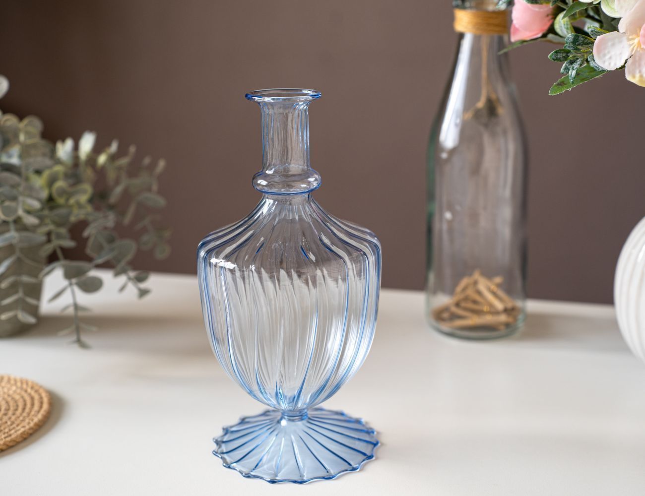 Порой бывает, что один-единственный прекрасный цветок или удивительная ветка требуют персонального оформления, но обычная ваза оказывается слишком просторной, маленькая вазочка слишком низкой, а разные бокальчики слишком лёгкими и неустойчивыми… Чудесное решение - нежная голубая вазочка, специально созданная именно для таких случаев! Устойчивая, достаточно вместительная для воды и при этом словно наполненная чистым воздухом, она надолго сохранит красоту цветка и послужит ему достойным обрамлением.