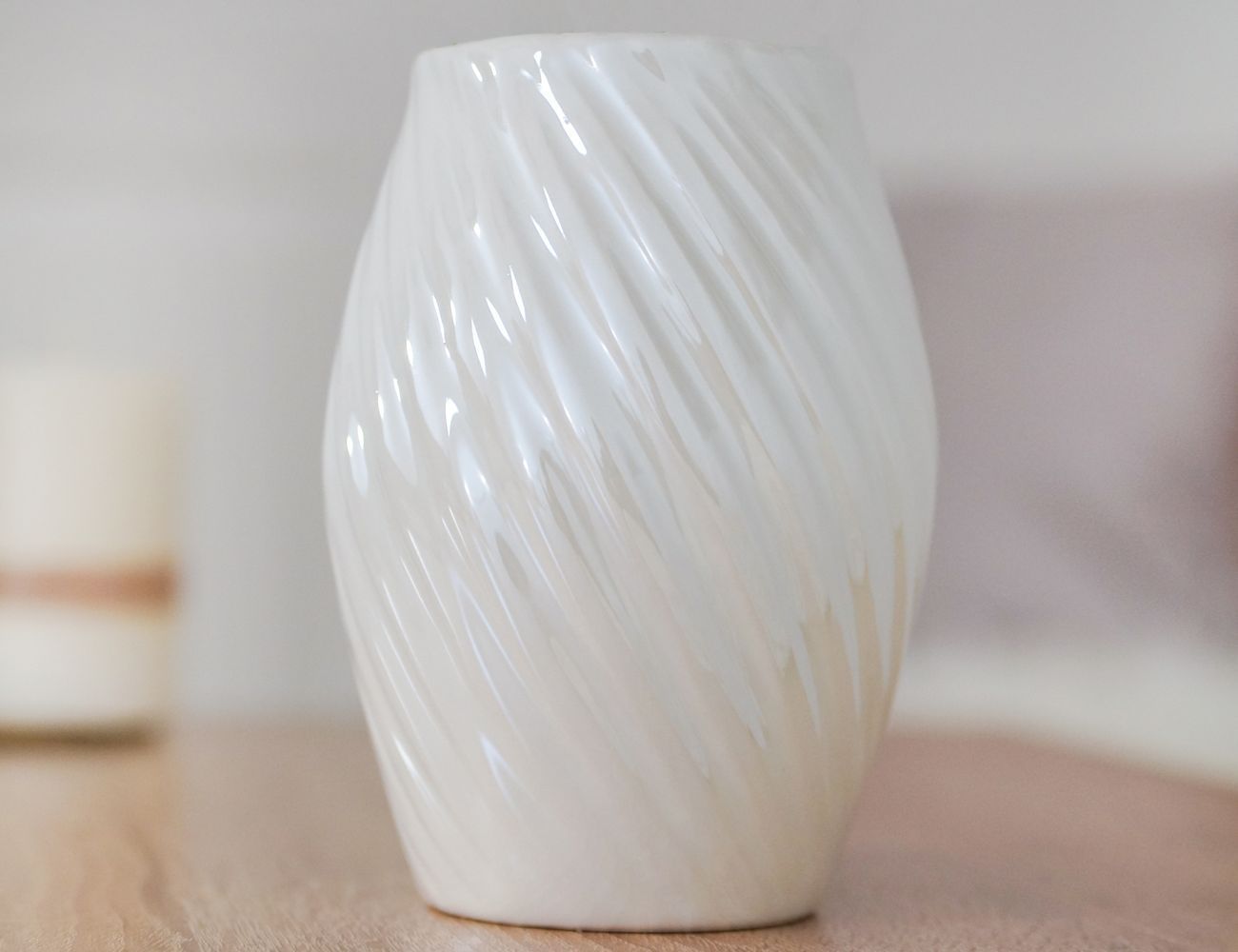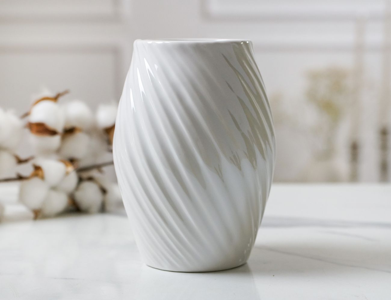Словно перламутровый вихрь обнял белоснежную глину, а улетев, оставил в память о себе круговорот линий… Великолепная керамическая ваза станет стильным и очень красивым акцентом в любом интерьере и подарит не только радость созерцания самой себя, но и практическую пользу, ведь цветы, декоративные ветки и разнообразные композиции будут смотреться в ней необычайно эффектно!