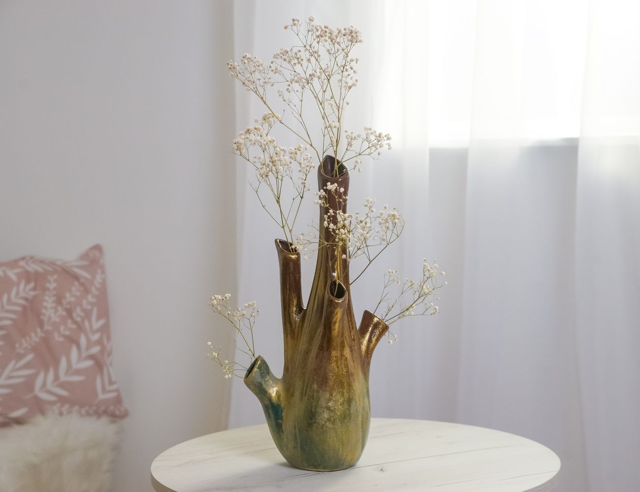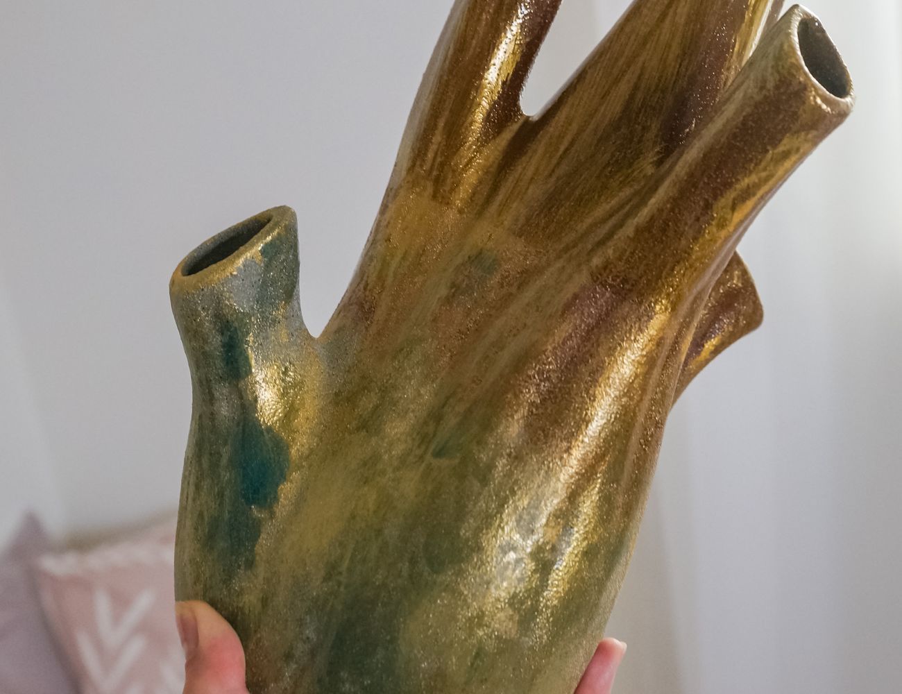 Бывают предметы строгие и даже чопорные, а бывают вот такие: ваза-фантазия, ваза-настроение, ваза-идея для творчества! Осенние листья или полевые цветы, декоративные ветки или перья - всё в ней будет притягивать и завораживать, но и без наполнения она будет играть жизнерадостными природными красками и золотистым глянцем, наполняя пространство теплом и светом!