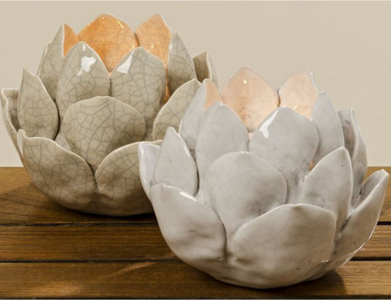 Изящный керамический подсвечник в форме кувшинки с хрупкими лепестками привнесет в ваш дом романтическую атмосферу. Его нежный светлый оттенок напоминает цвет утреннего тумана над водой. Этот подсвечник прекрасно дополнит интерьер спальни или гостиной в стиле Прованс, шебби-шик или бохо.
