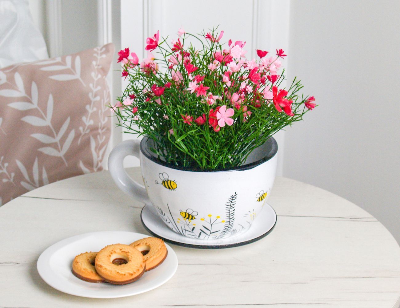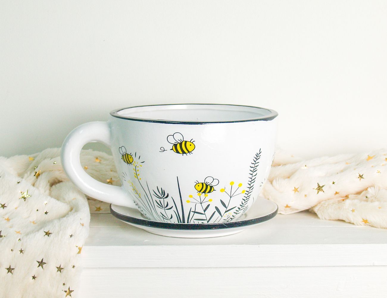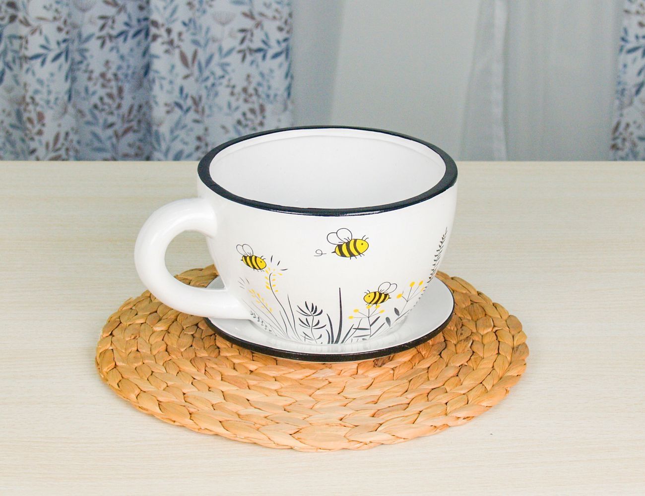 Очаровательное керамическое кашпо в уютной форме чайной чашечки с блюдцем и принтом с весёлыми пчёлками среди желтых цветочков дарит самые солнечные, самые летние эмоции! Поместите его на подоконник или полку - оно поднимет настроение одним своим видом!