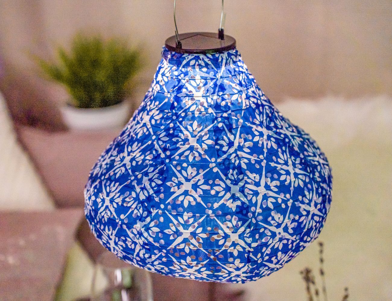 Большой стол с душистым чаем, ароматным вареньем, домашним печеньем и любимыми конфетами, освещённый мягким и таким уютным светом от большого, обтянутого тканью абажура… Знакомая с детства картинка, правда? Очаровательный подвесной светильник "Астериск" поможет вам воссоздать эту замечательную картину в современной, но от этого не менее уютной версии. На дачной террасе или в беседке синий светильник подарит чудесную атмосферу, не потребовав от вас никаких усилий, ведь он снабжён солнечной батареей.