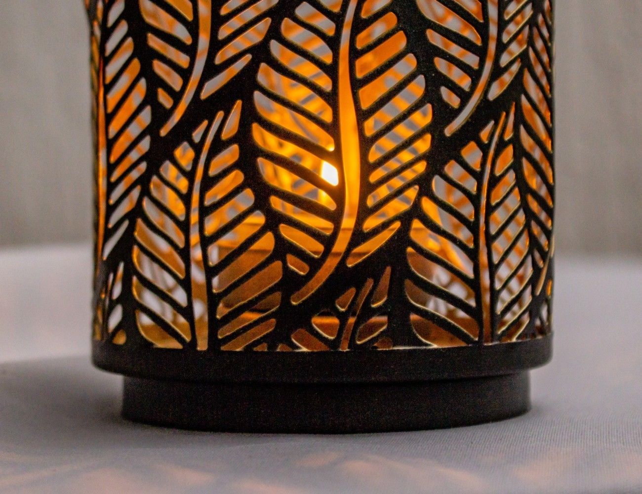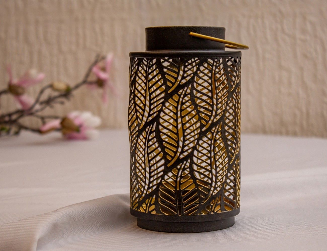 Изящный лиственный орнамент, в который складываются прорези этого подсвечника, создаст удивительную кружевную тень. А золотистое внутреннее покрытие сделает свет очень мягким и теплым. Прекрасный аксессуар для создания романтичной и немного сказочной атмосферы!