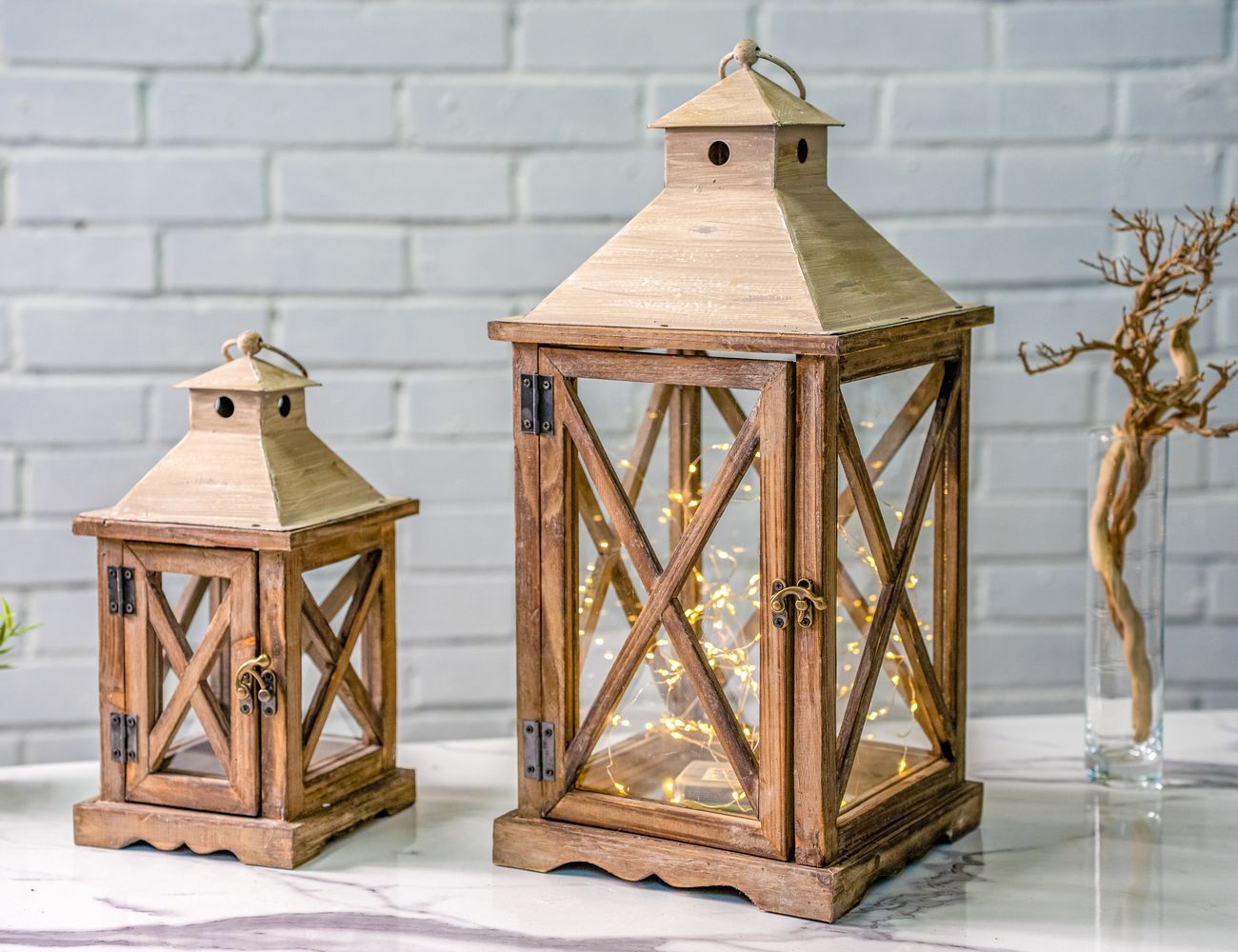 Товары для дачи и сада. Набор декоративных подсвечников-фонарей КАСА КРЕМА, стекло, дерево, 32 см и 48 см, 2 шт. 2021198. IntexCorp - интернет магазин.