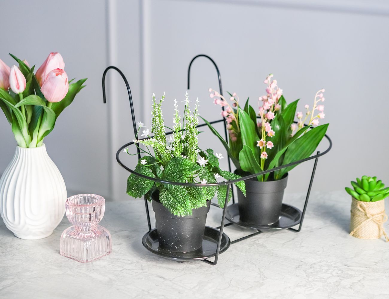 В тёплое время года бывает полезно 'переселить' на балкон некоторые комнатные растения, дав им возможность побыть в естественных условиях. Для этого отлично подойдёт специальный подвесной держатель 'Ригби', рассчитанный на два кашпо. И, конечно, вы можете использовать его и для традиционных летних растений, украсив таким образом балкон или террасу.