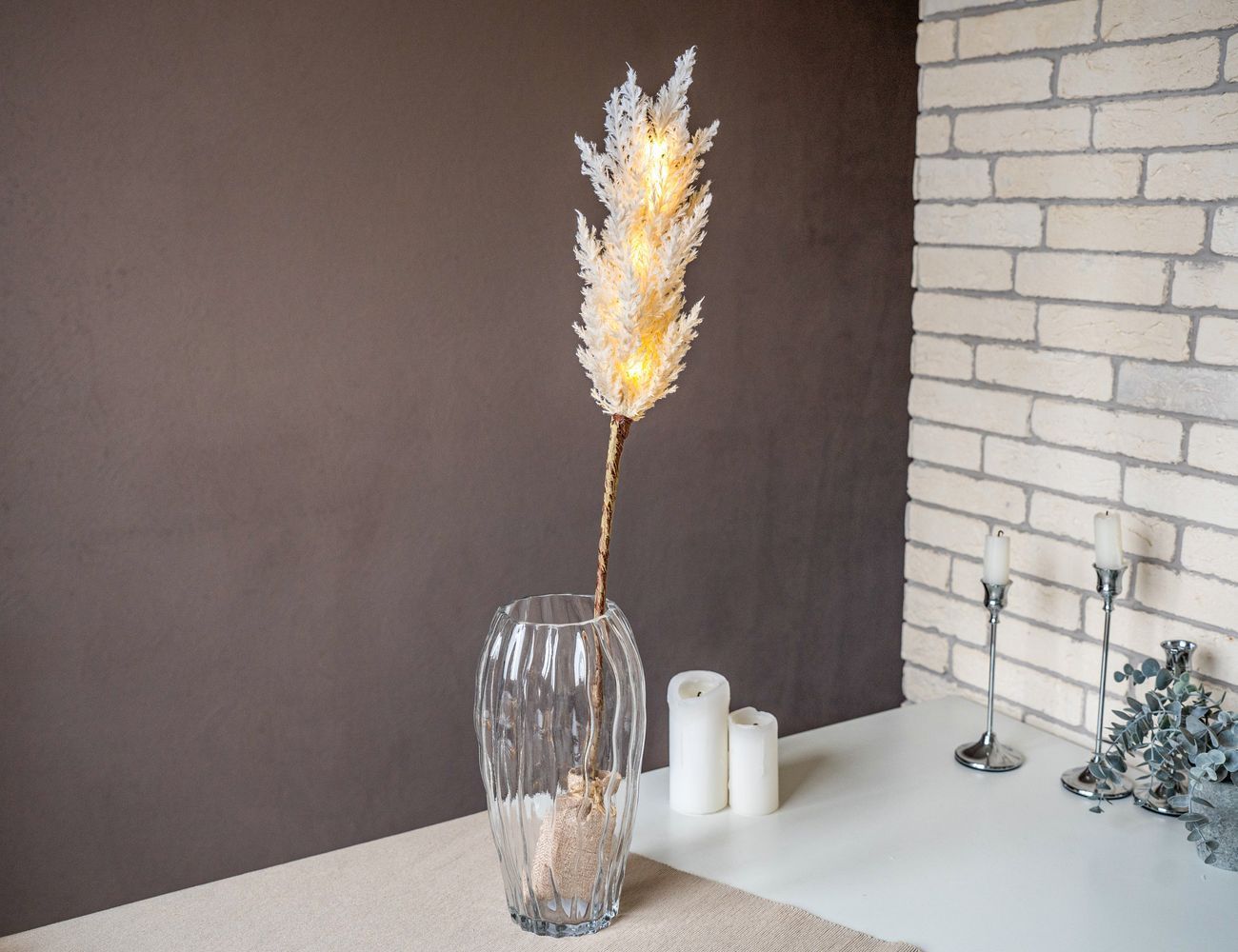 Экзотичная, роскошная Кортадерия восхищает своими пышными, воздушными соцветиями-перьями, тем более вот такими - кремовыми, подсвеченными тёплыми огоньками! Эта роскошная декоративная ветка будет очень эффектно смотреться в высокой вазе и сама по себе, и в изысканном букете!