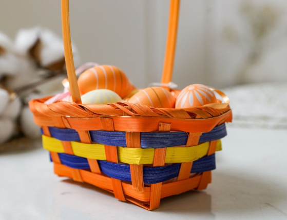 Удобно, красиво, позитивно - принцип, которым руководствовались дизайнеры, создавшие оранжевую корзинку с высокой ручкой. Натуральный материал, жизнерадостное сочетание ярких цветов - корзина отлично подойдёт для пасхальных 'крашенок', а также будет симпатичным интерьерным дополнением, где можно хранить разнообразные мелочи.