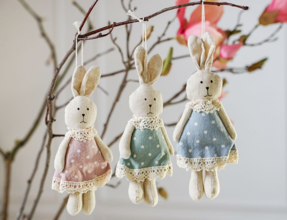 Пасхальная коллекция. Подвесное украшение ЗАЙКА ГОРОШИНКА в голубом платьице, текстиль, 17 см 22-014-2. IntexCorp - интернет магазин.