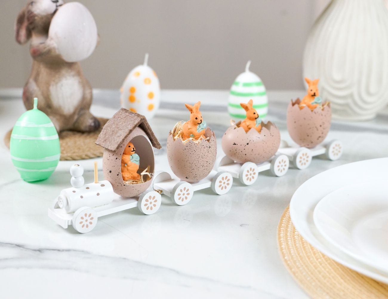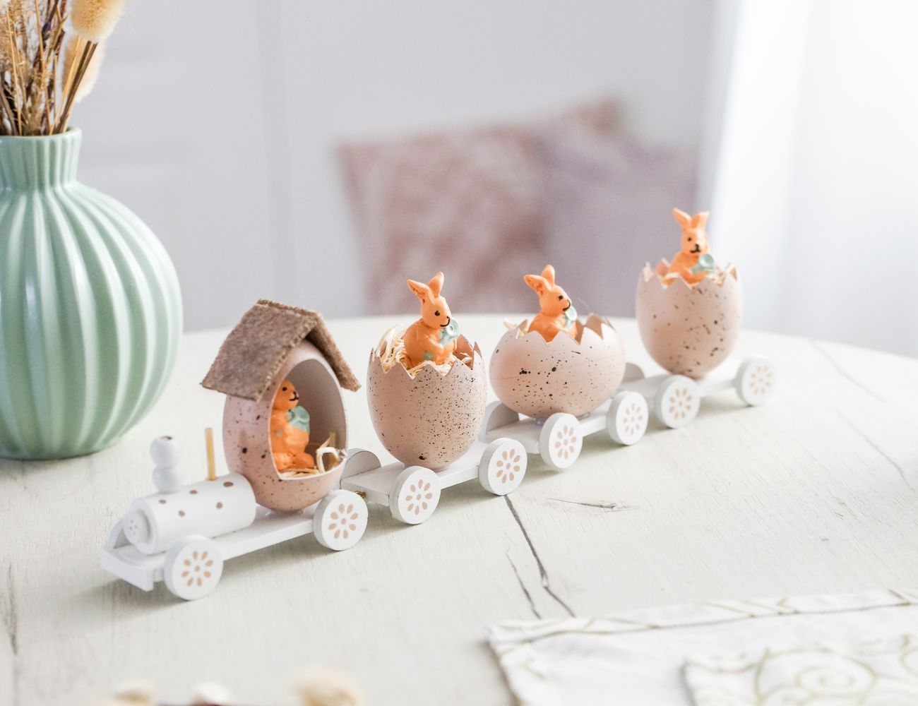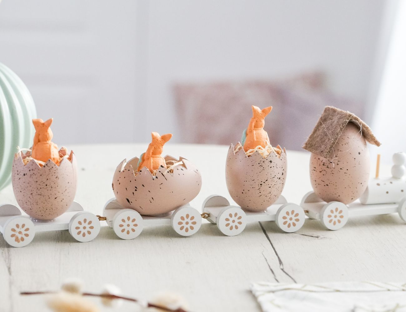 Если вы готовитесь встречать Пасху, то у вас, конечно, масса дел! Что ж, на помощь выдвигается розовый пасхальный паровозик сразу с тремя вагончиками, где уже устроились ваши помощники. Достаточно накрыть стол праздничной скатертью, поставить среди прочей сервировки паровозик и, вот, уже ни у кого не останется сомнений, что это пасхальный стол: тут и кролики, и крашенки - всё что нужно, чтобы с радостью впустить в дом весну!