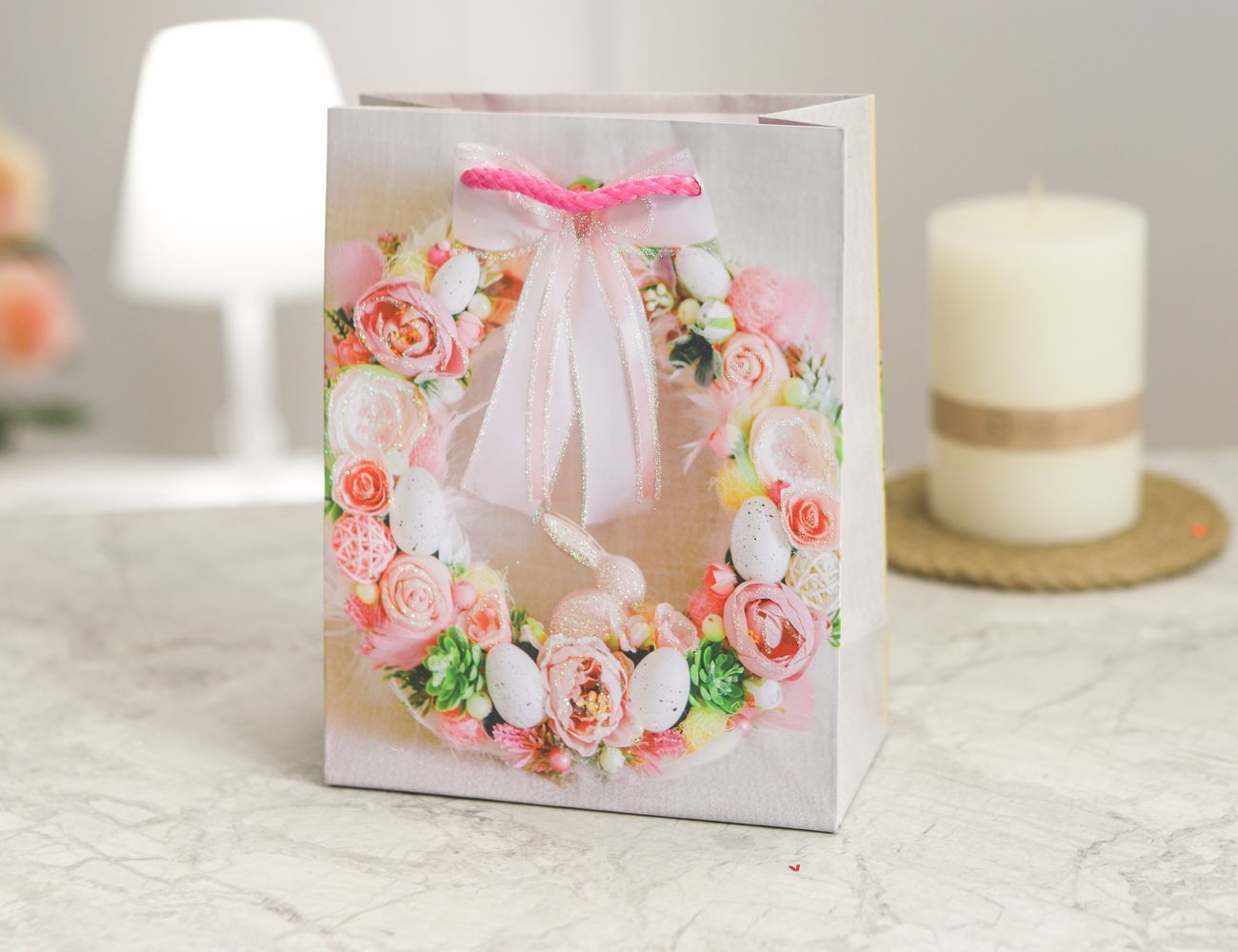 Подарочный пакет ПАСХАЛЬНЫЙ ВЕНОК - ВОЗДУШНЫЙ РОЗОВЫЙ, бумага, 18х14 см